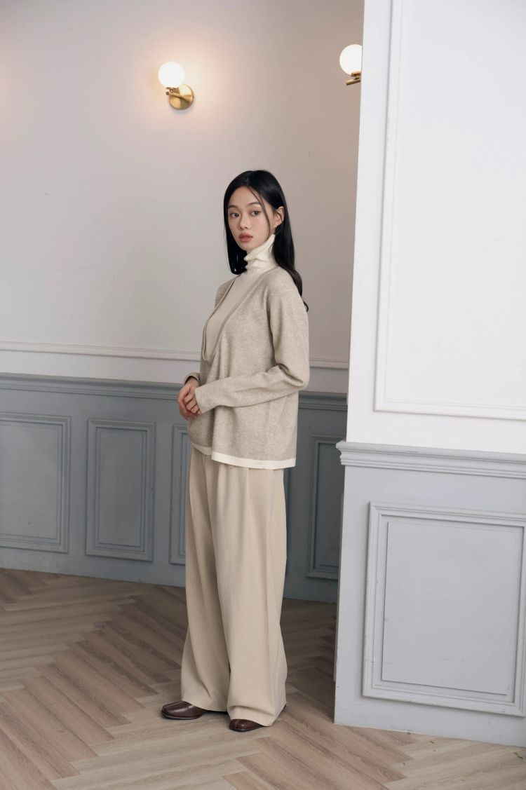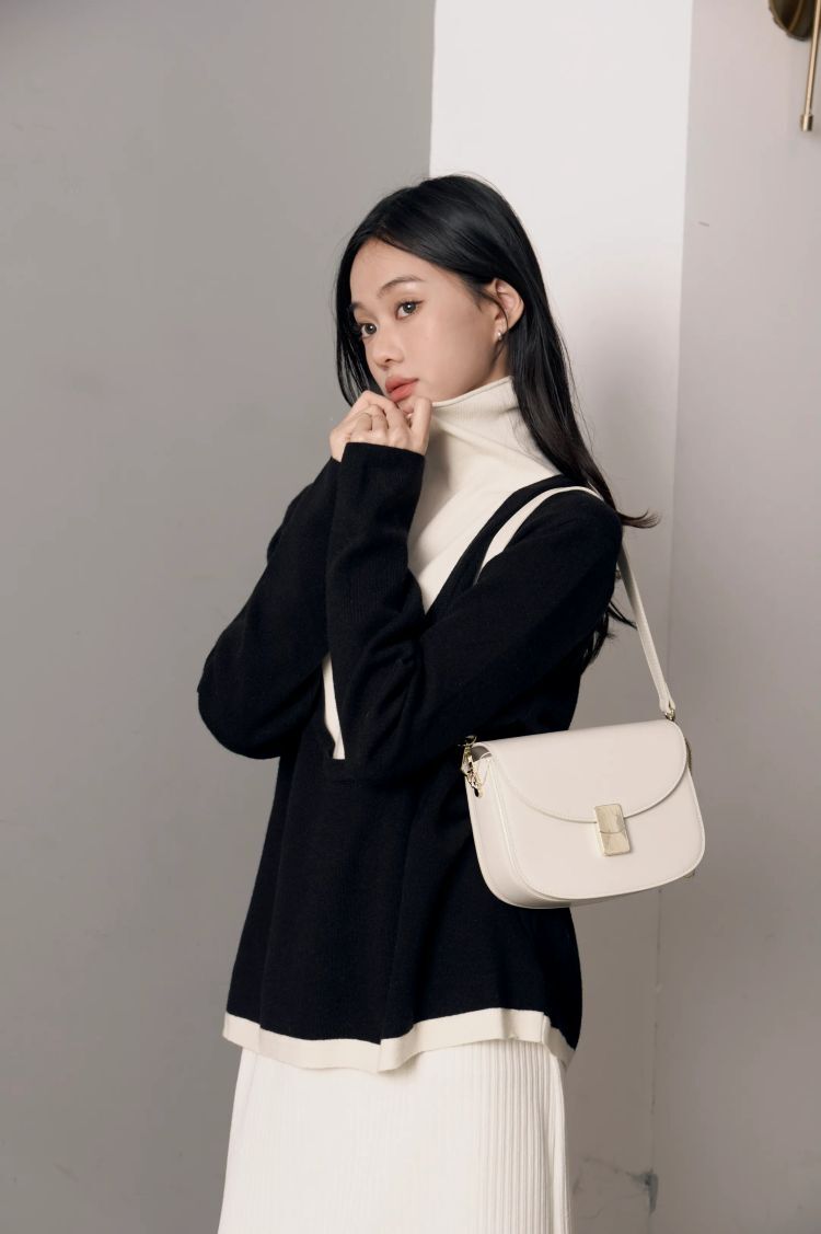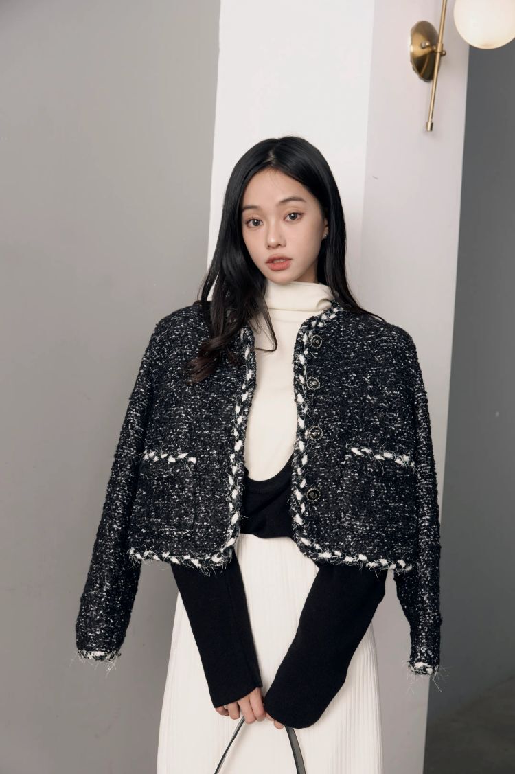 俐落的高領剪裁為基礎,融合異材質拼接設計