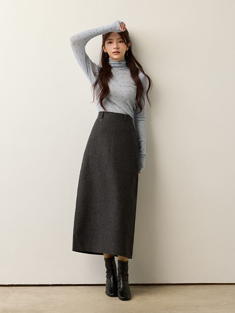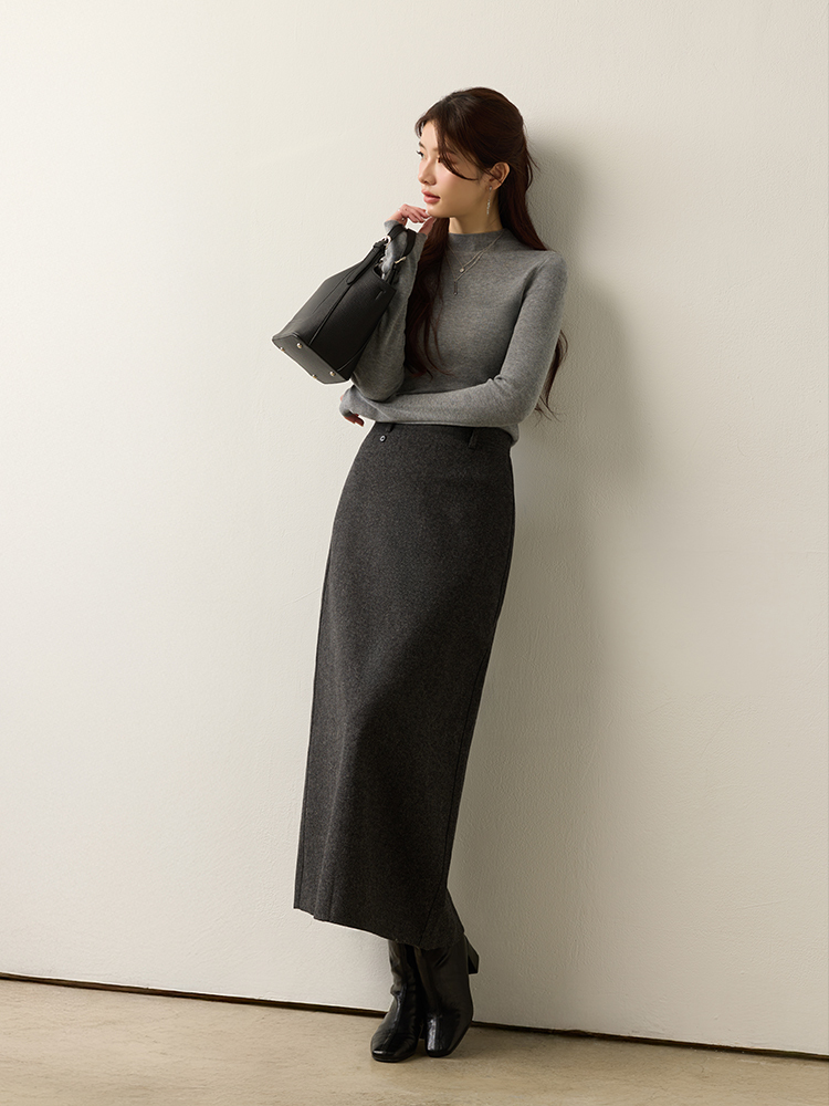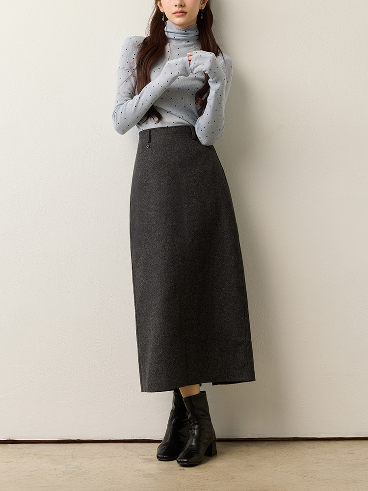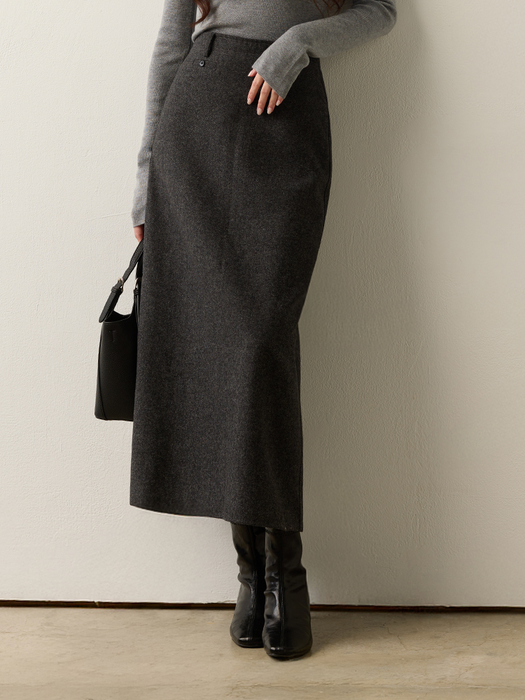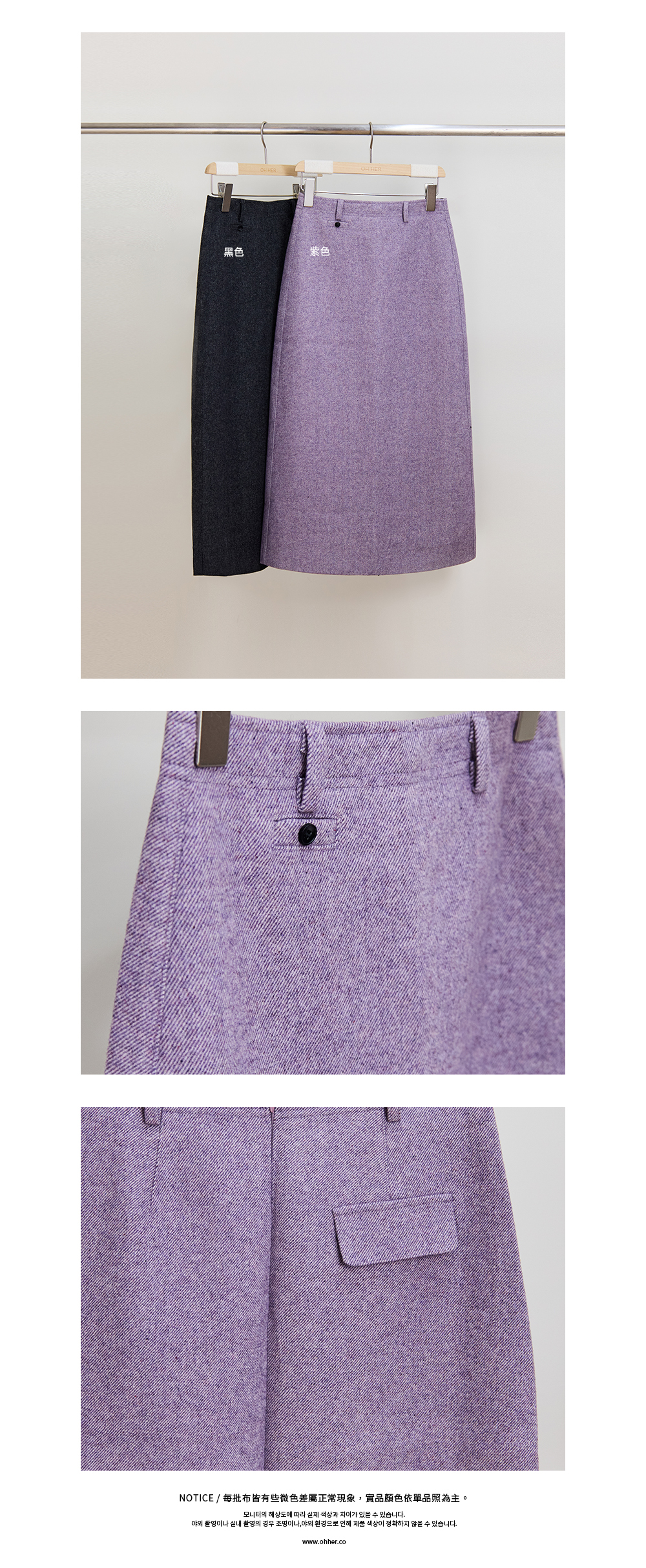 裝飾口袋後開衩毛呢長裙(50%羊毛)