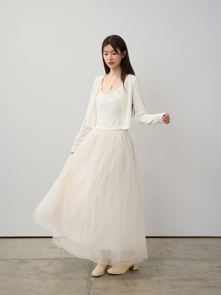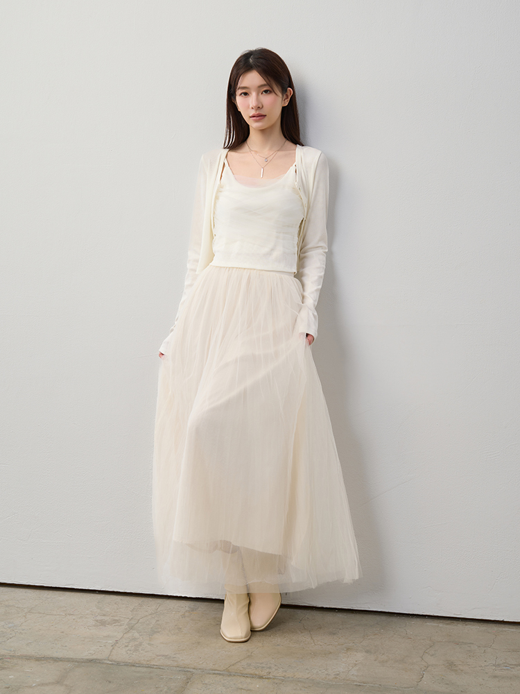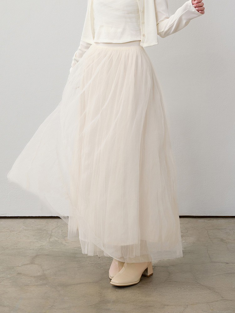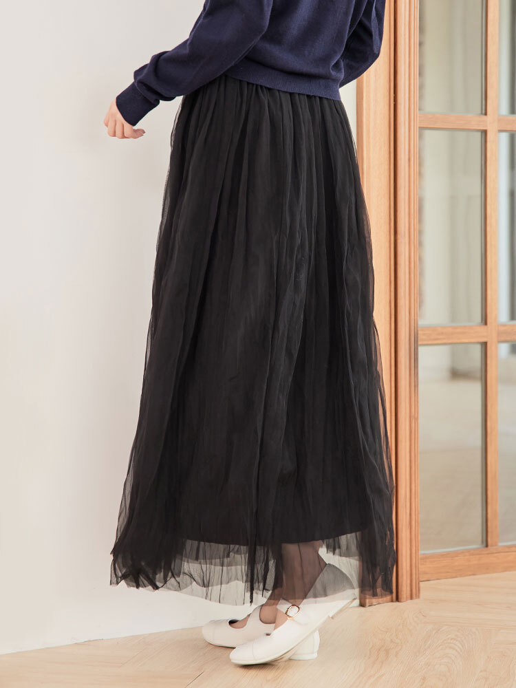 細緻網紗蓬鬆修身裙,雙層內裡與後鬆緊腰圍,輕盈飄逸又舒適