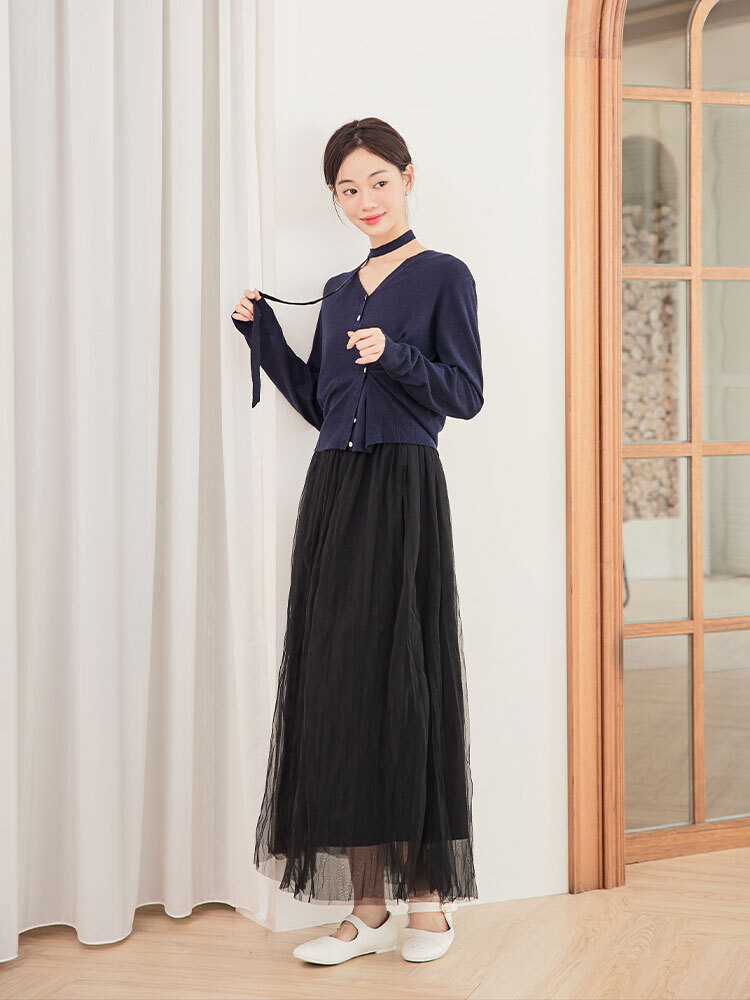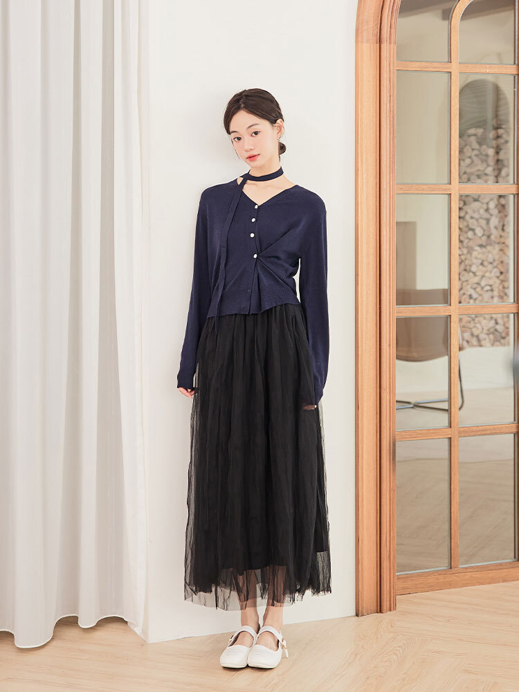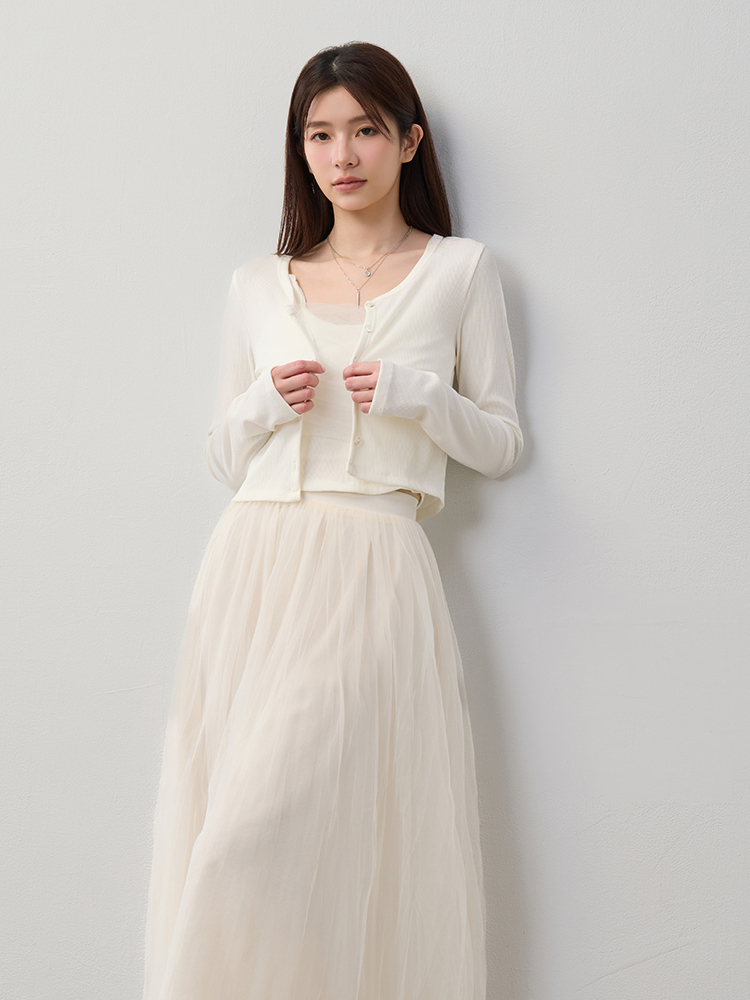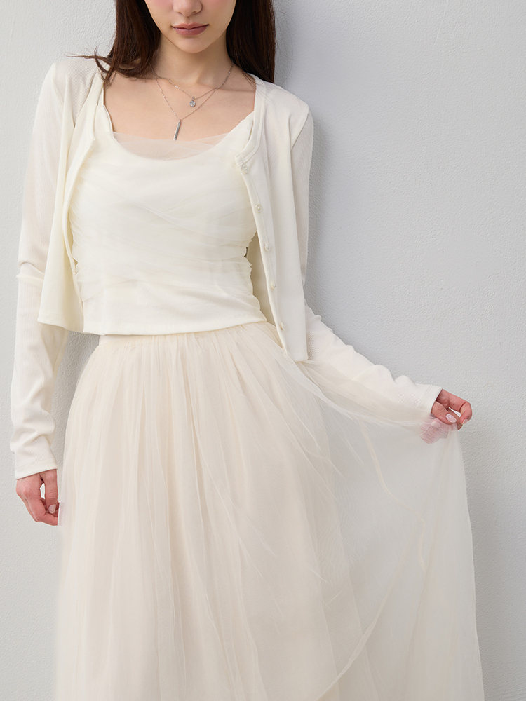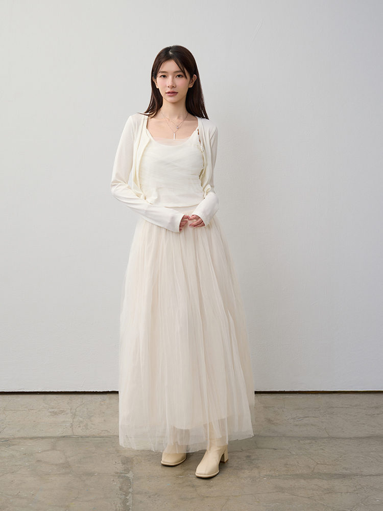 細緻網紗蓬鬆修身裙,雙層內裡與後鬆緊腰圍,輕盈飄逸又舒適