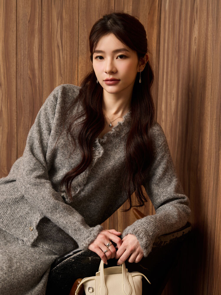 柔軟細膩毛絨針織紋理,搭配花瓣領口,勾勒溫柔精緻輪廓