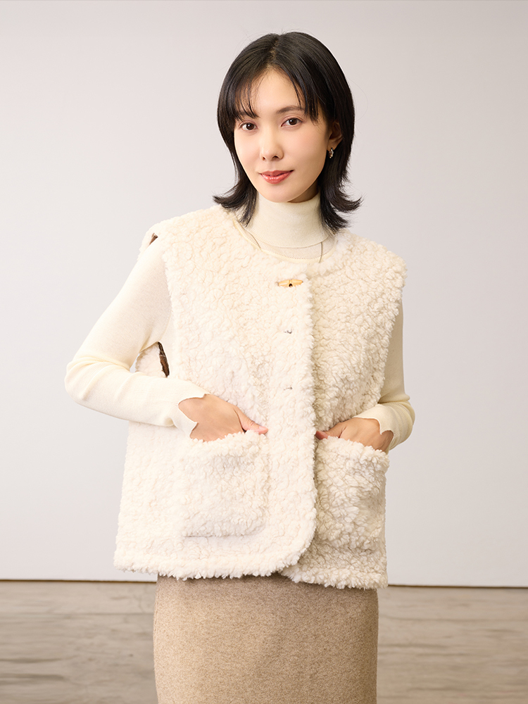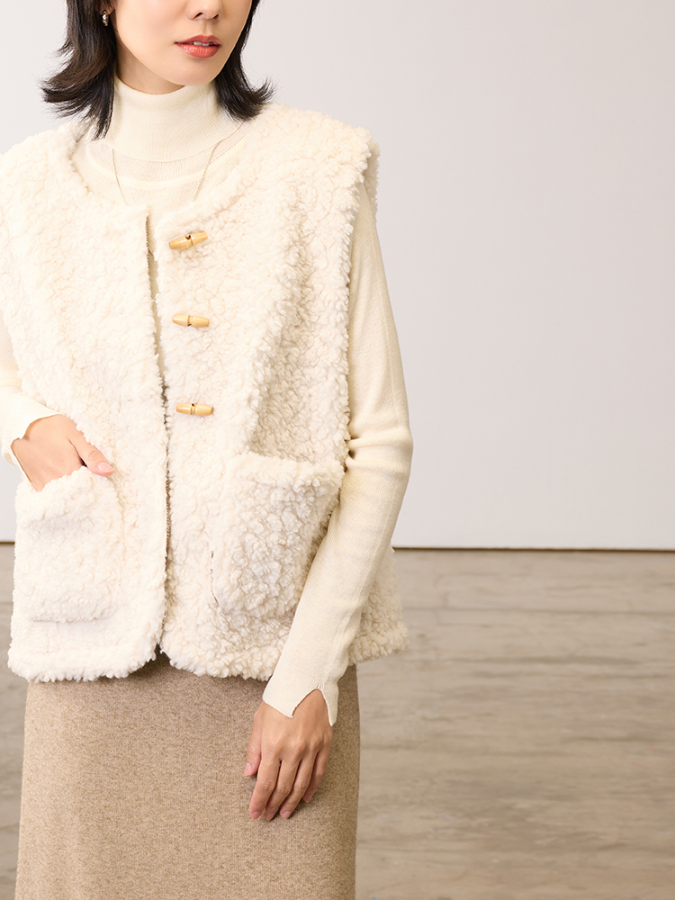 羊羔毛面:選用淺色牛角釦,天然紋理,注入溫潤質感