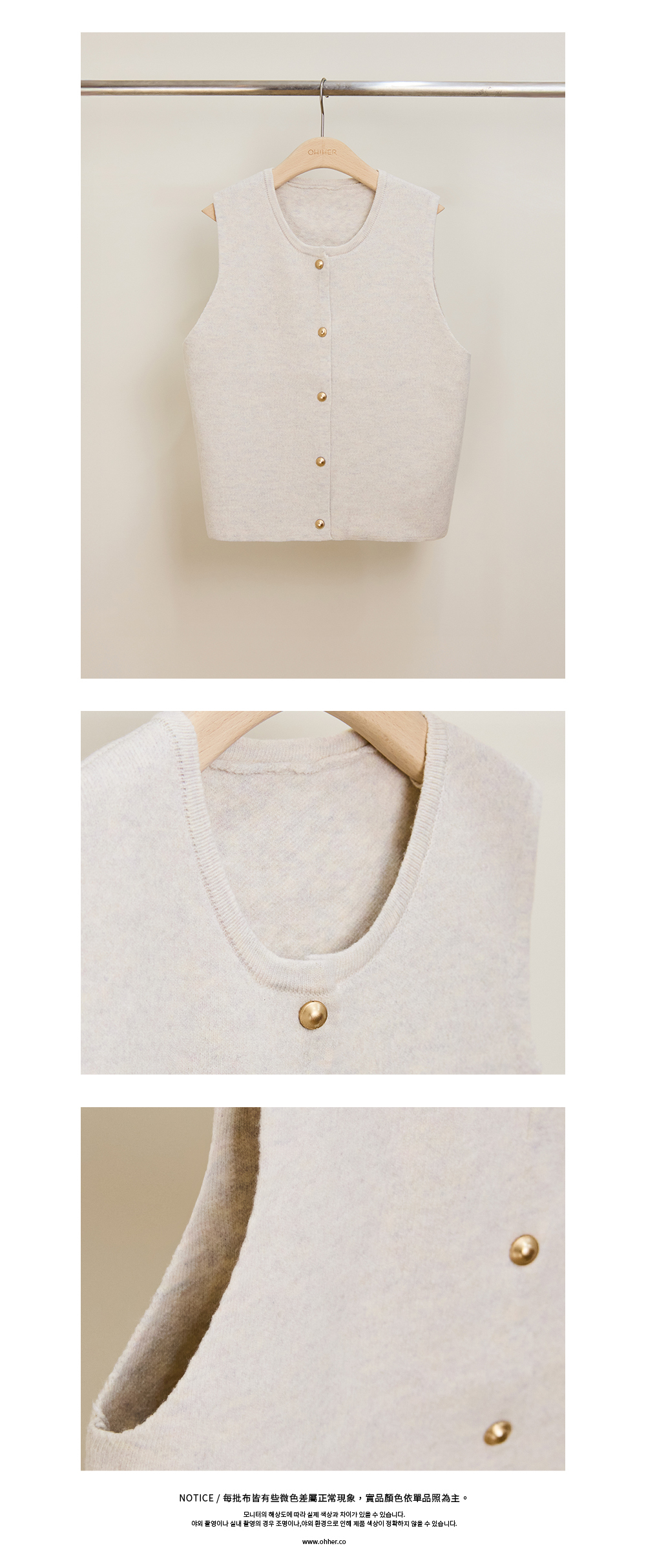 寬版圓領針織背心,柔軟親膚面料搭配低調金色素釦,舒適百搭打造優雅日常造型