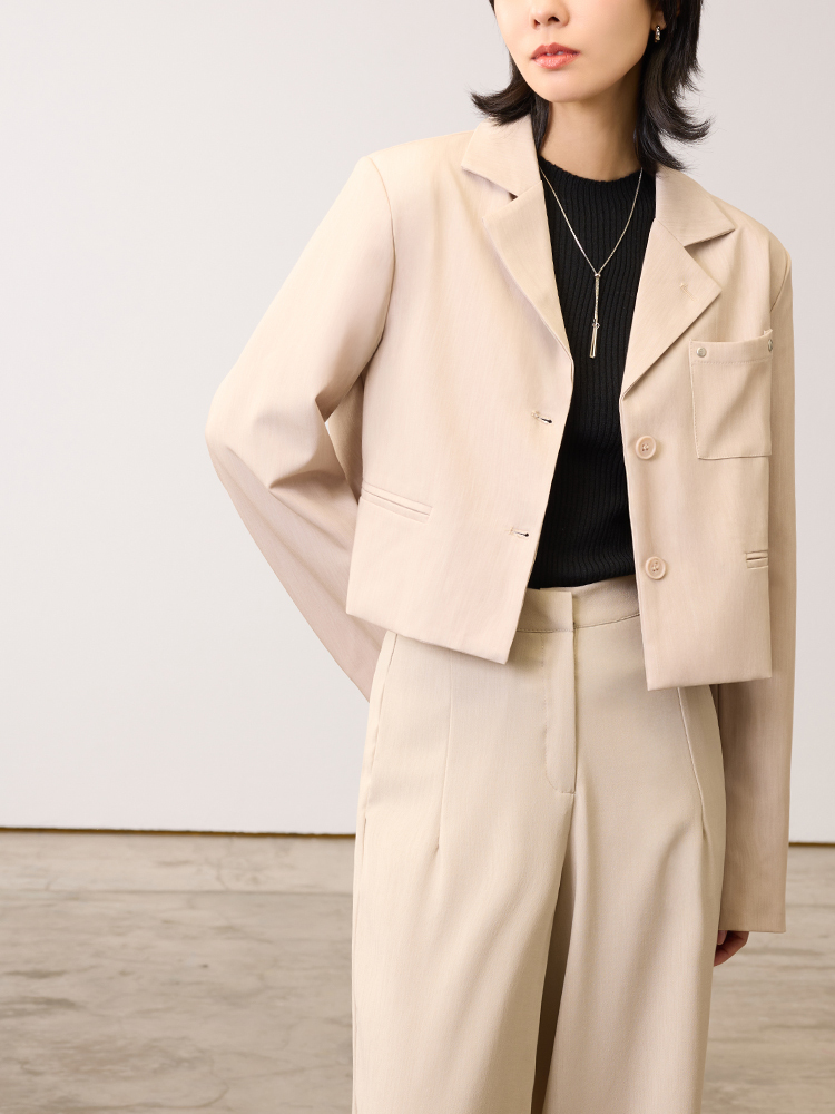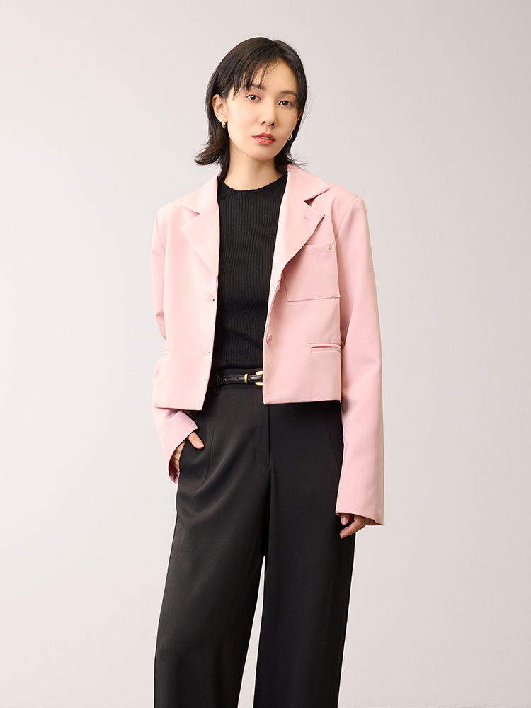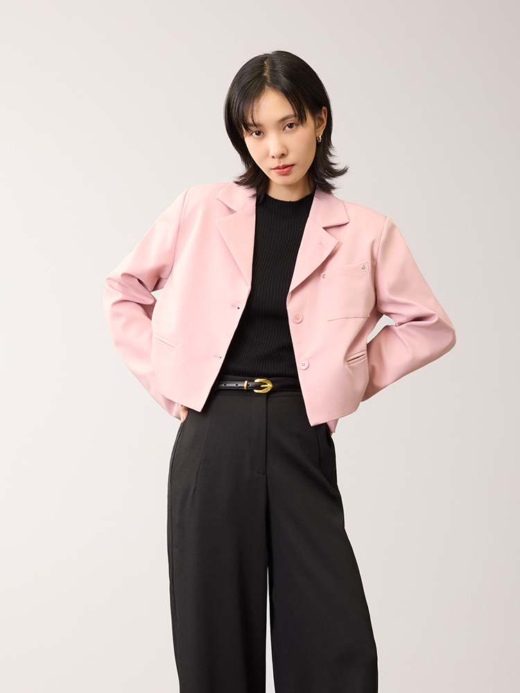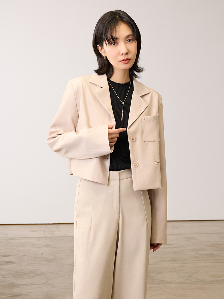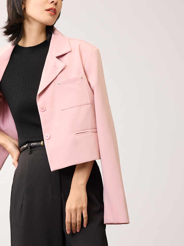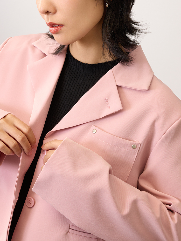 前口袋銀色五金飾釦點綴,增添層次感與精緻度