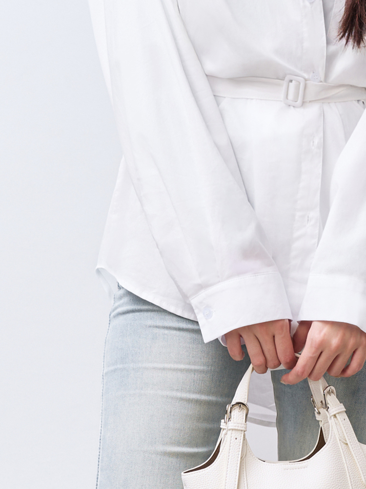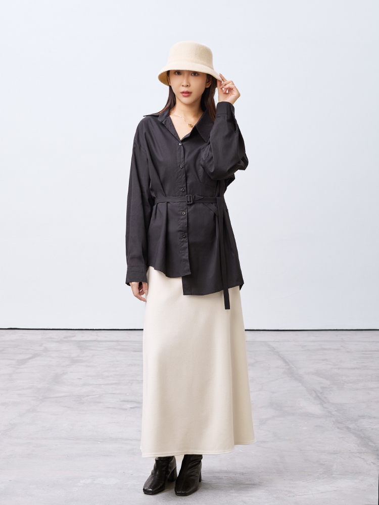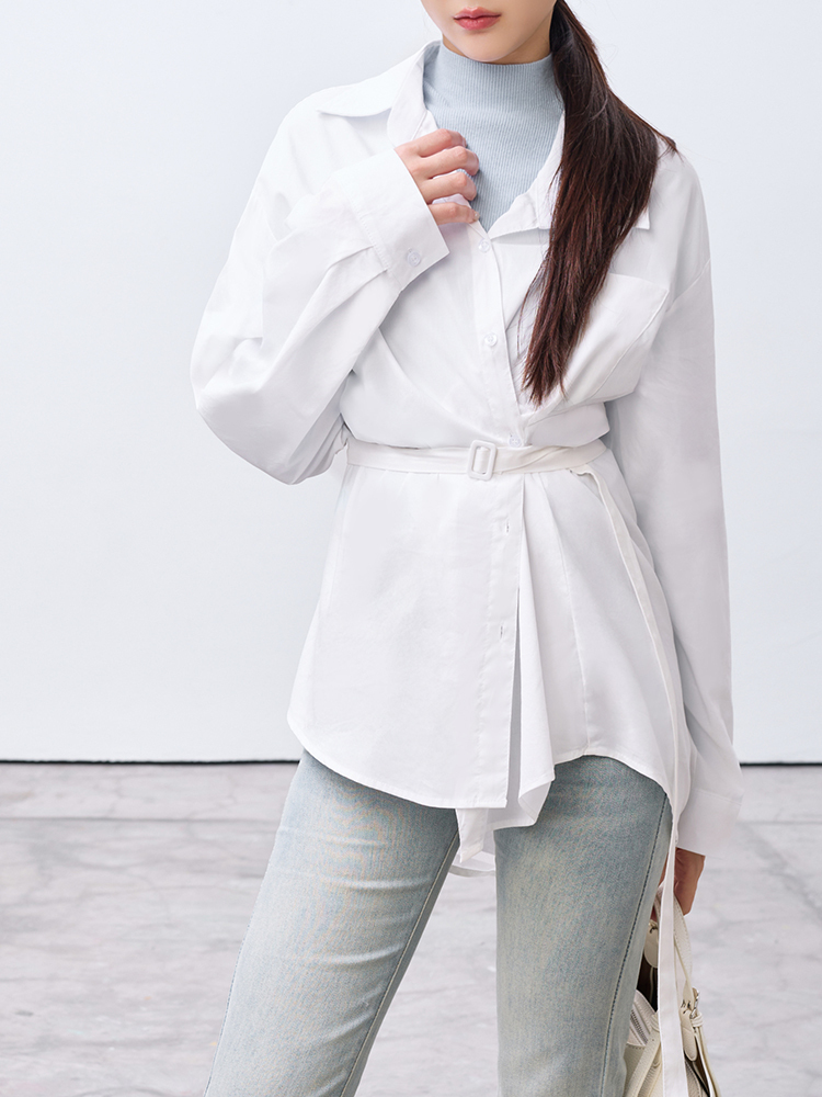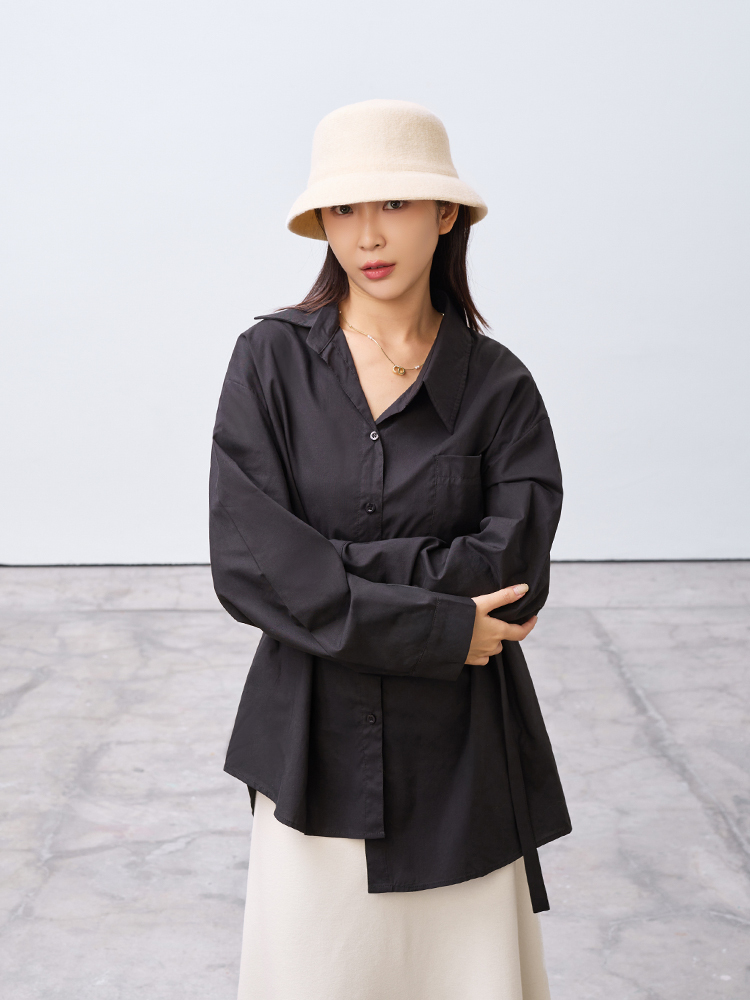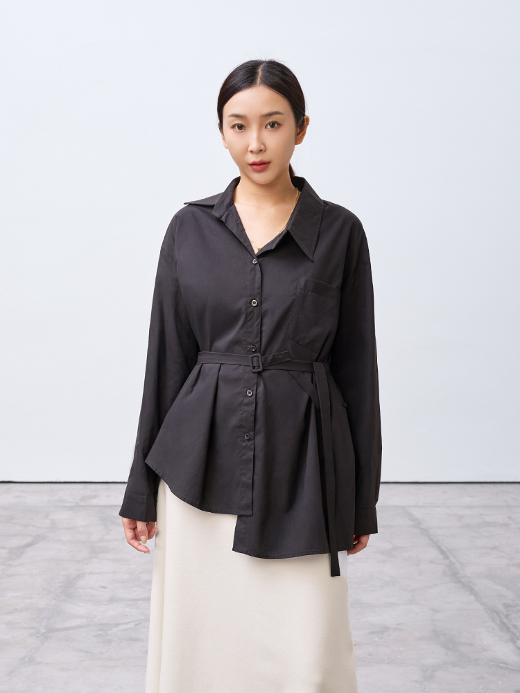 跳脫傳統襯衫版型,以不對稱線條打造層次視覺感,打造時尚風格