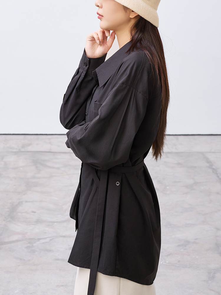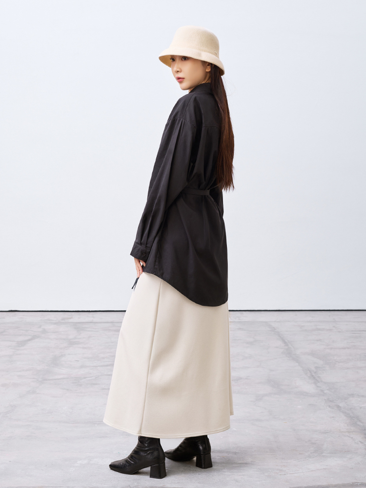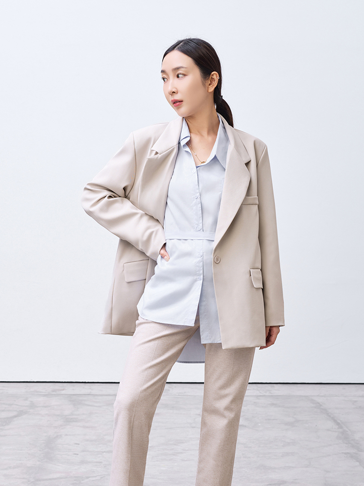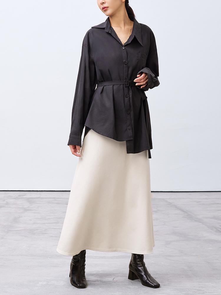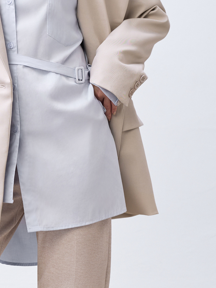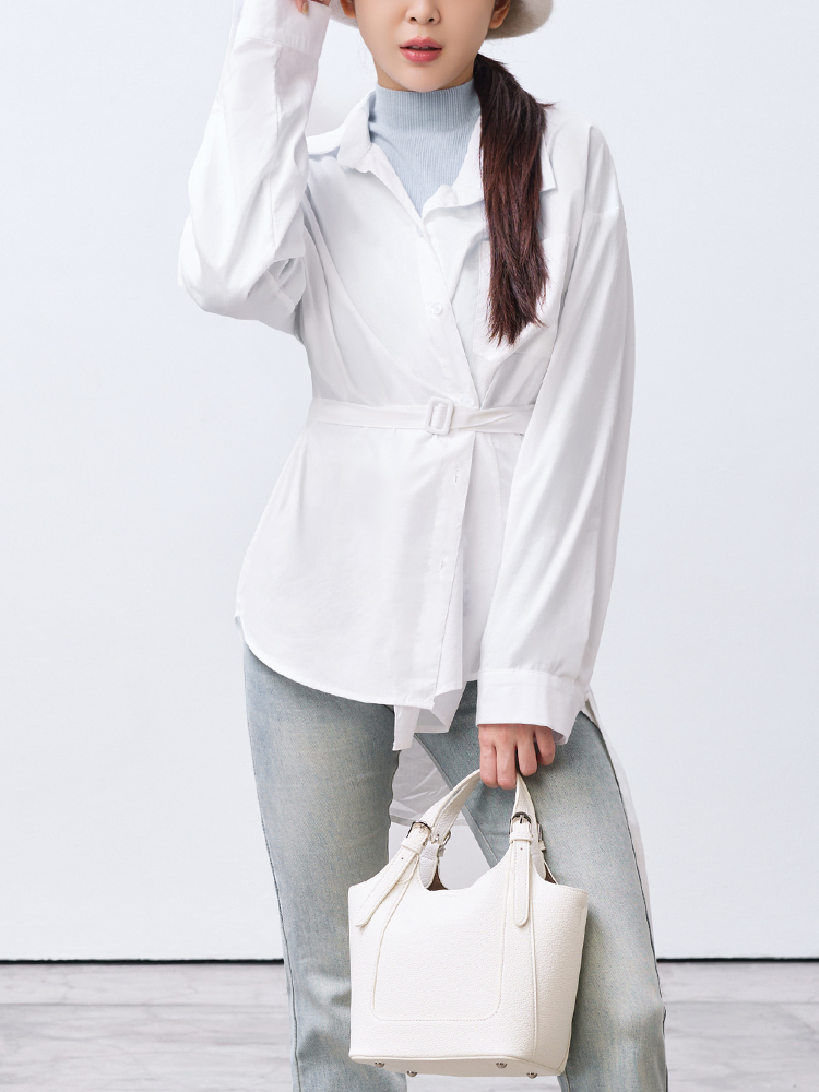 跳脫傳統襯衫版型,以不對稱線條打造層次視覺感,打造時尚風格