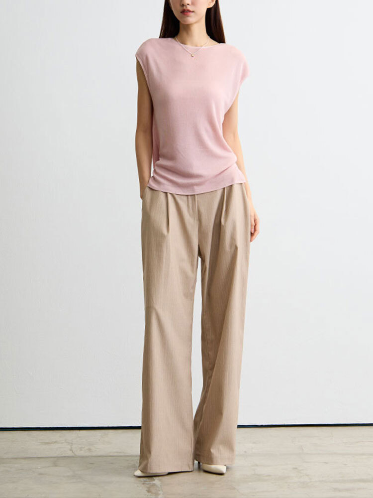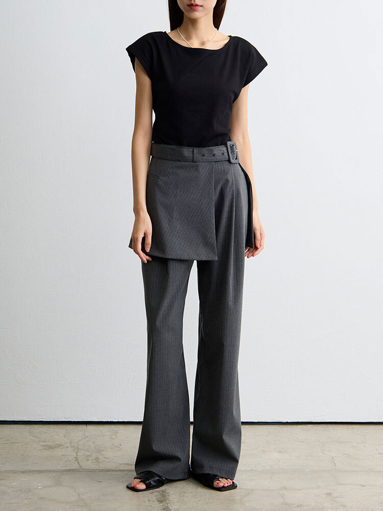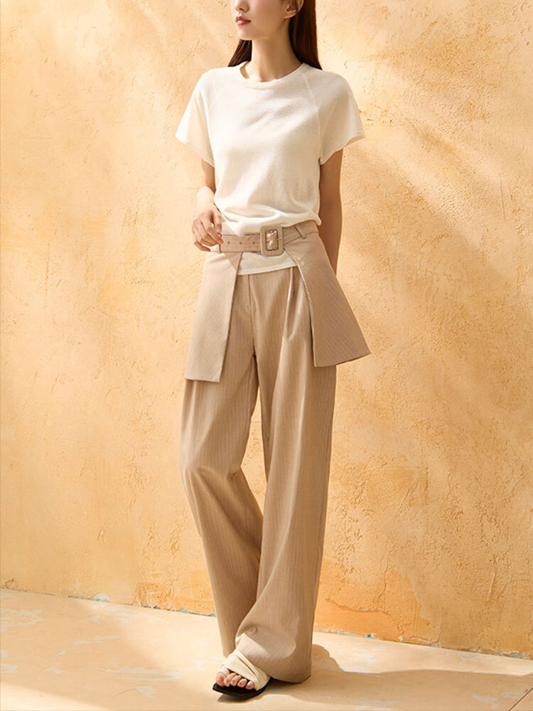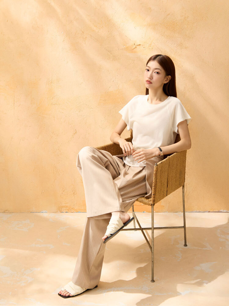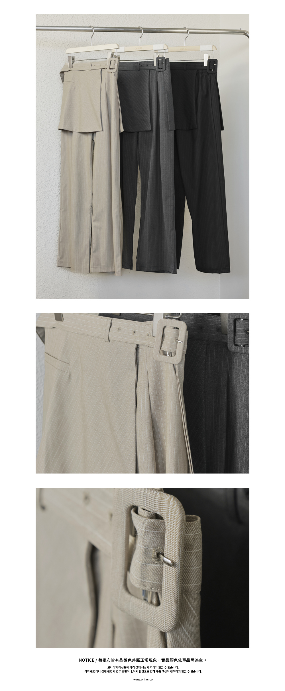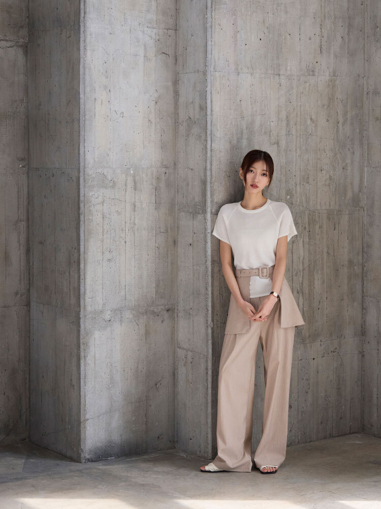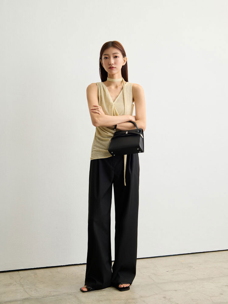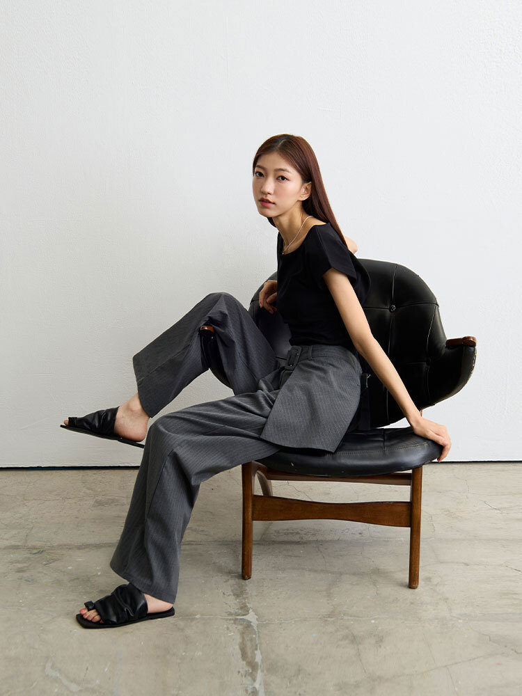 俐落直筒褲型搭配細條紋面料,修飾拉長腿部線條