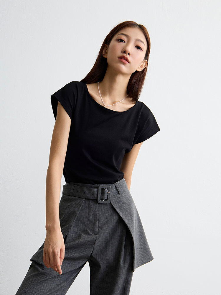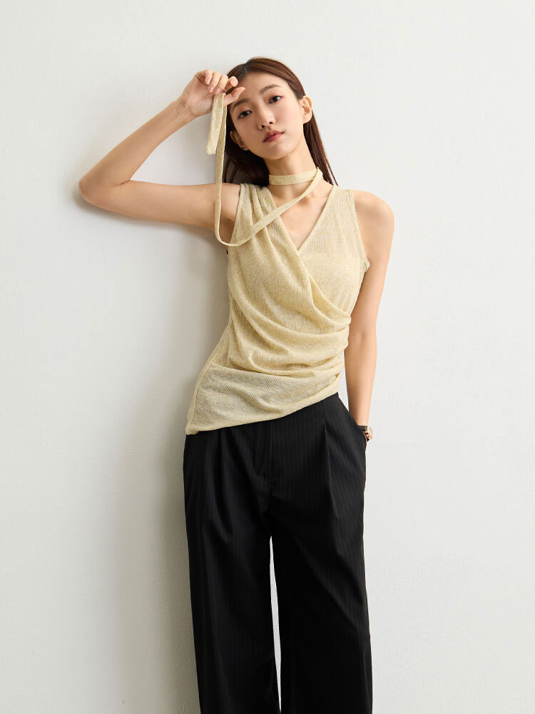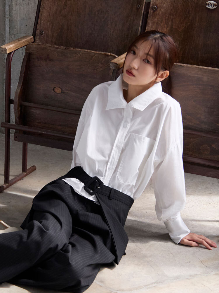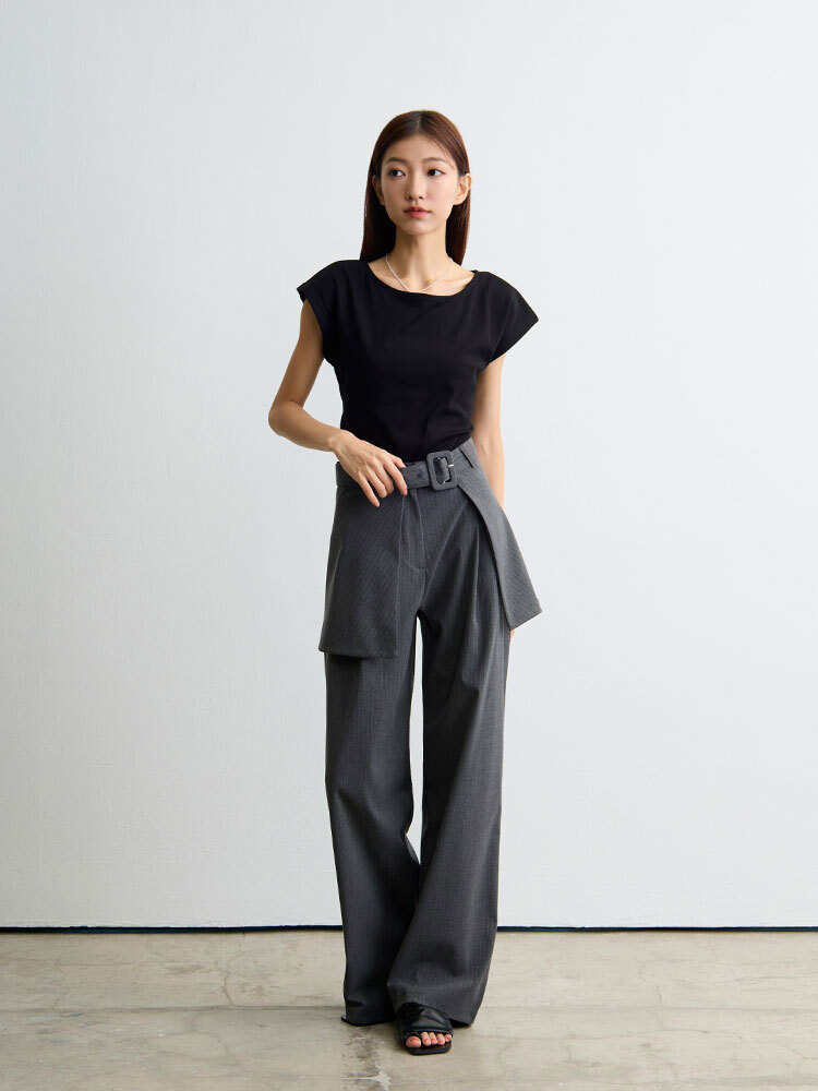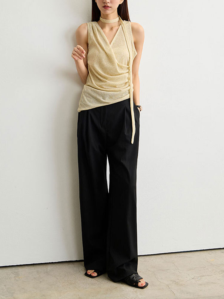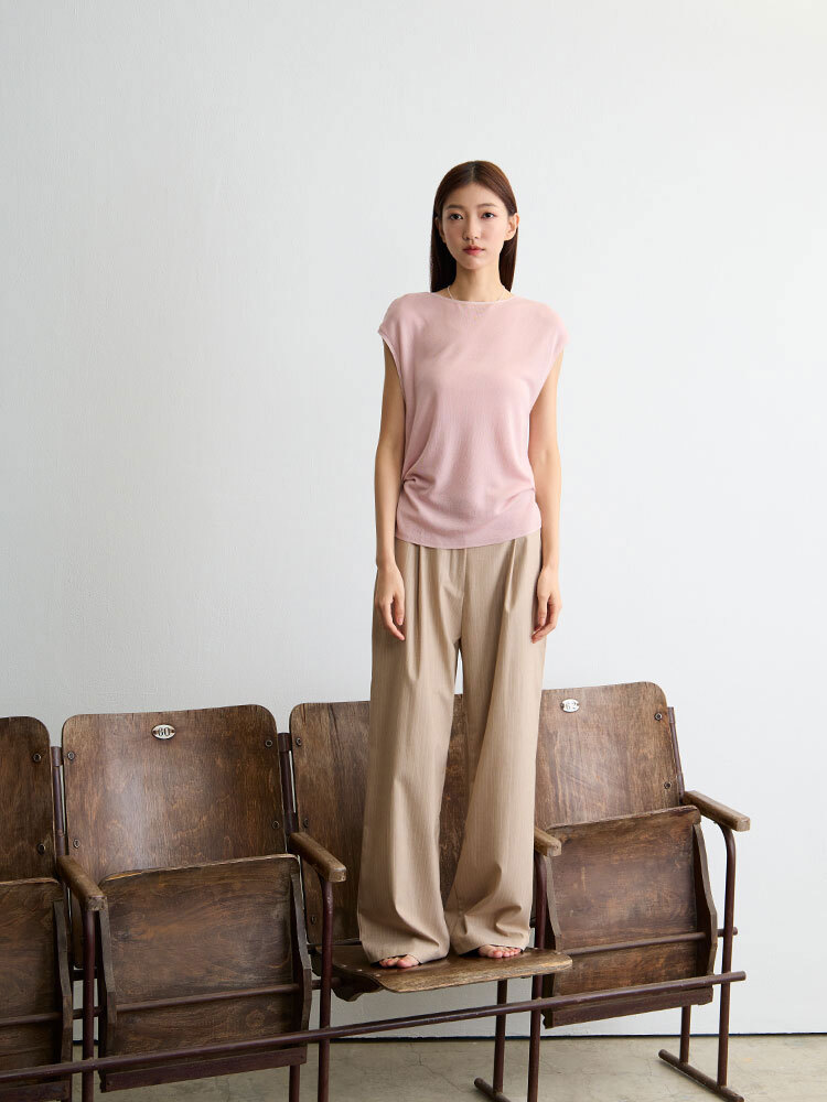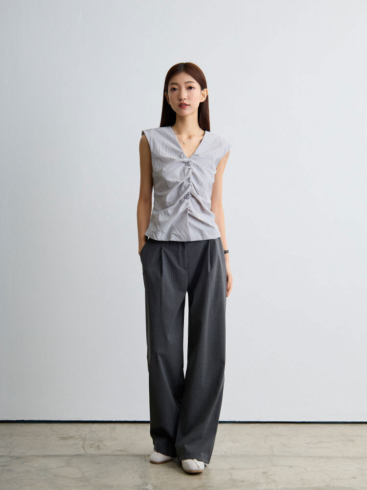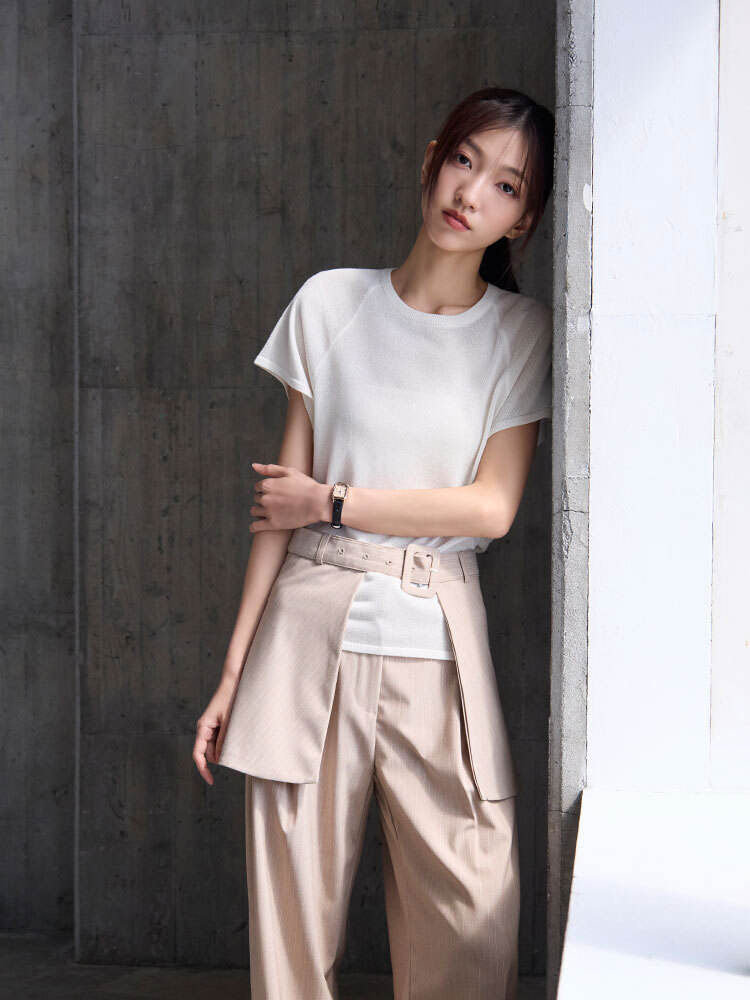 俐落直筒褲型搭配細條紋面料,修飾拉長腿部線條
