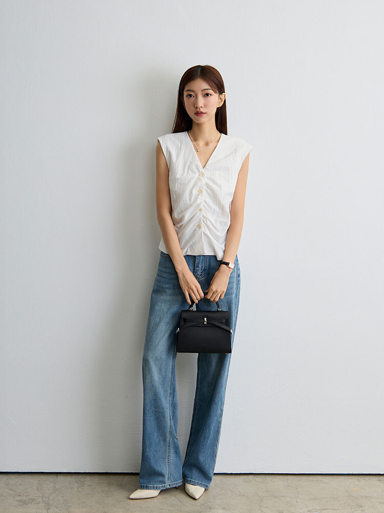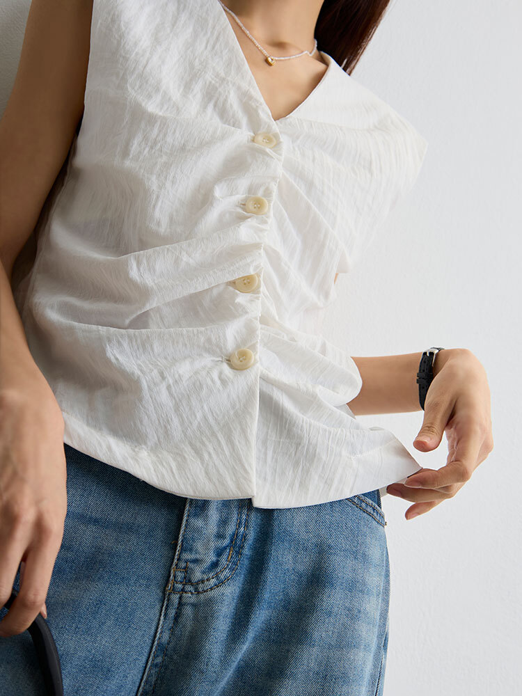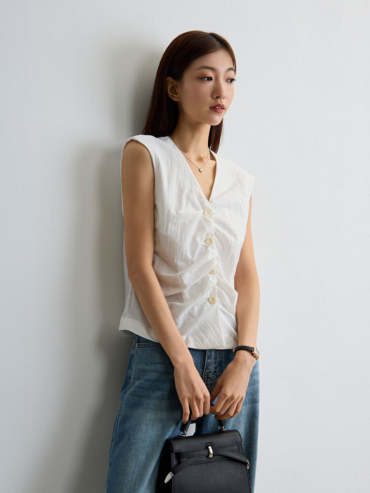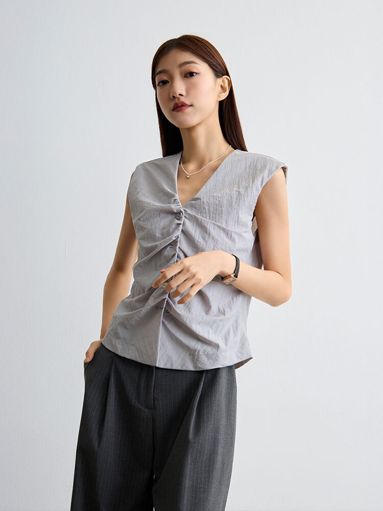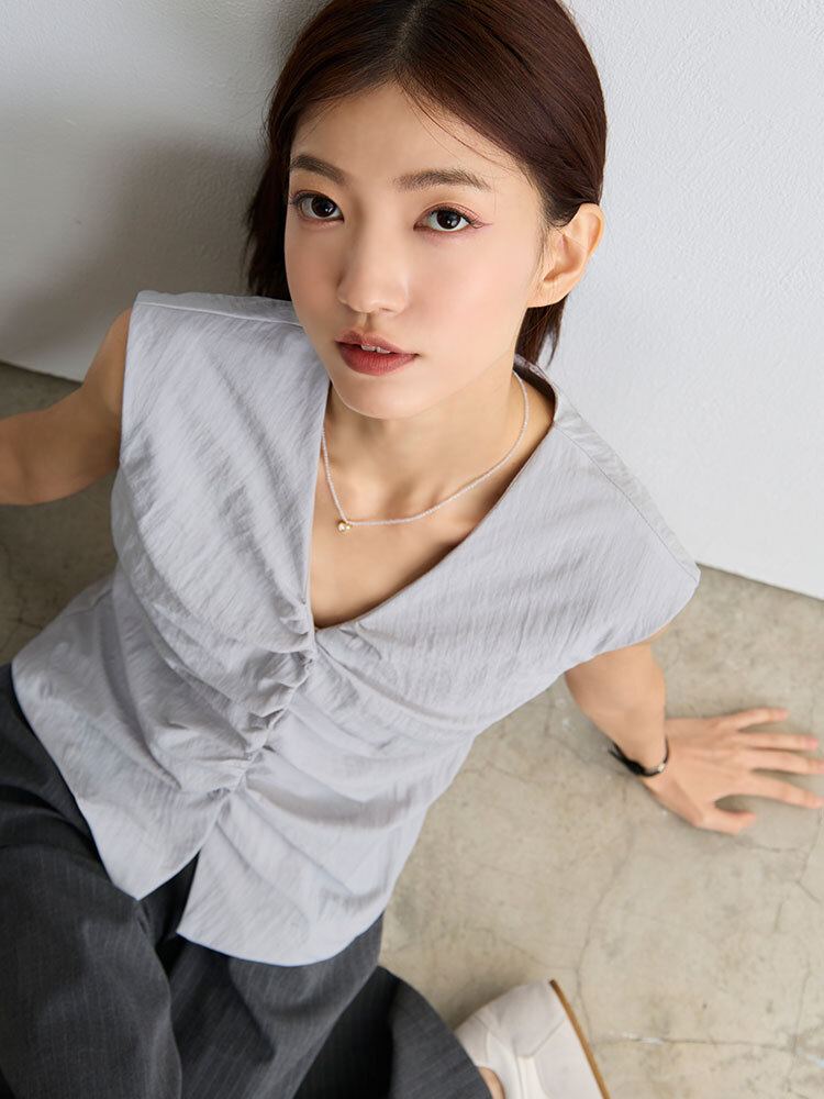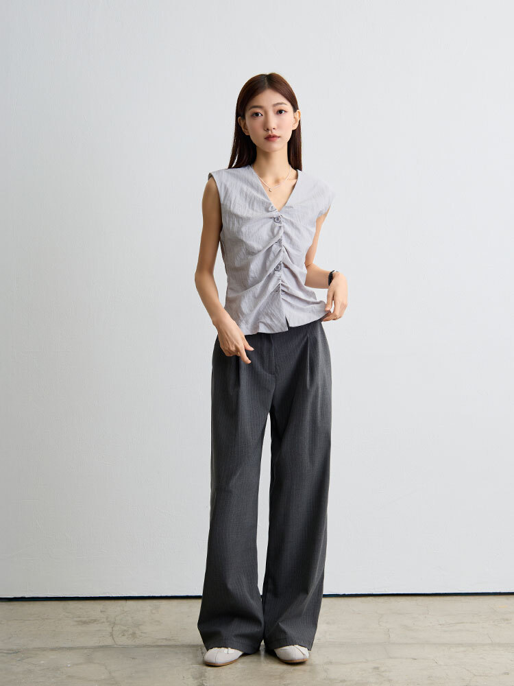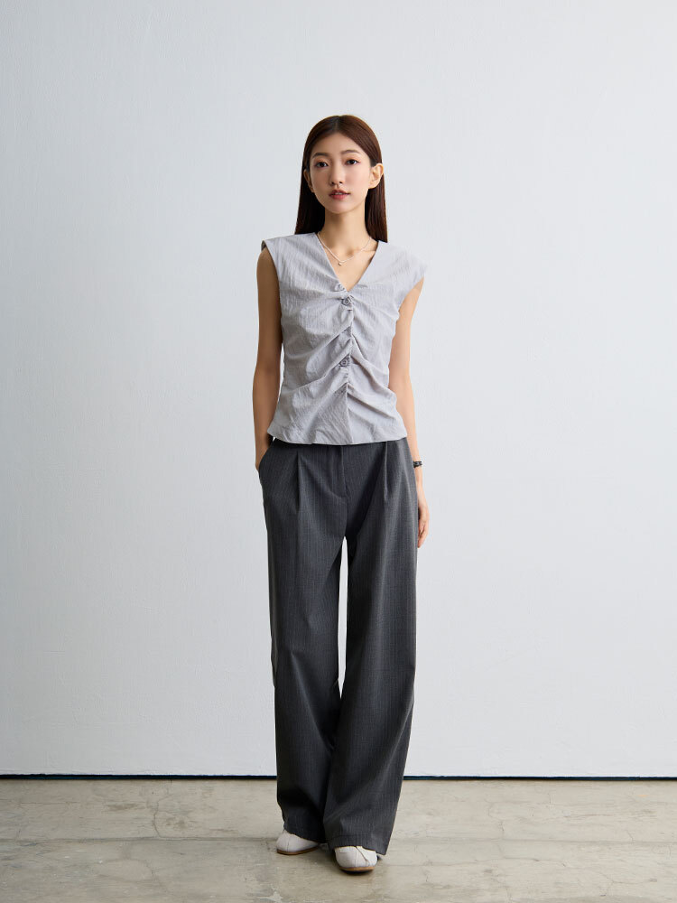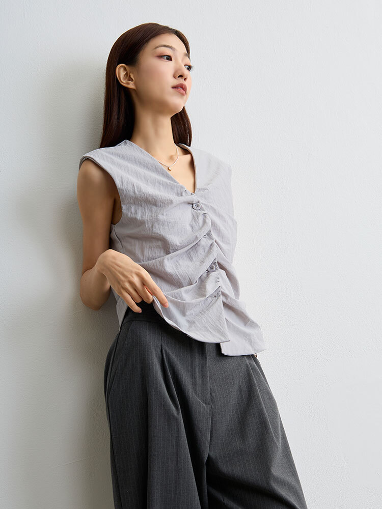 結合經典排釦元素與細緻抓皺工藝,為整體造型增添層次感